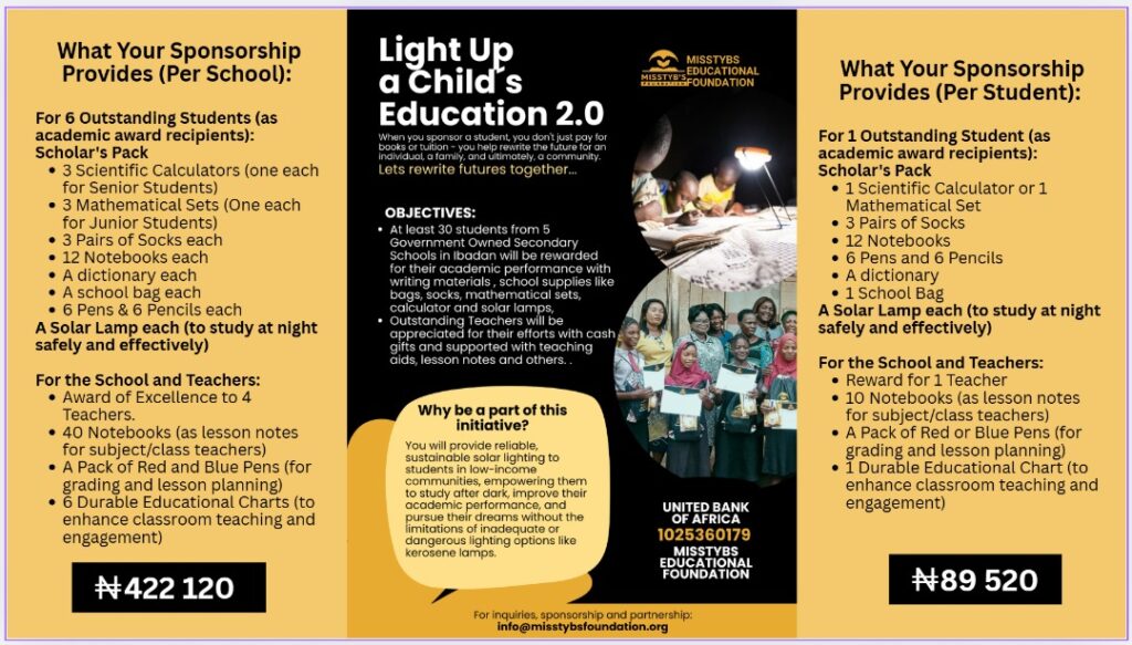 At MisstyBs Educational Foundation, We believe every child deserves quality education, irrespective of their background, social status, environment. Through this project, we aim to reward academic excellence and provide solar lamps to students in underserved communities – empowering them to learn beyond the classroom and inspiring them to reach their full potential. Solar lamps aren’t just a convenience – they are a lifeline. For students in the underserved communities like Ibadan, Nigeria where we visit, especially those attending government-owned schools, one small lamp represents the difference between a future dictated by circumstance and one shaped by choice. We aim to provide reliable, sustainable solar lighting to students in low-income communities, empowering them to study after dark, improve their academic performance, and pursue their dreams without the limitations of inadequate or dangerous lighting options like kerosene lamps. This project would create an engaging, inclusive learning environment for all students, regardless of their socio-economic background, by providing essential educational tools that make learning both enjoyable and effective. We would also support teachers with instructional charts and teaching aids to improve classroom delivery and productivity, ensuring that quality education is maintained even in overcrowded and under- resourced schools and reward their hard work.